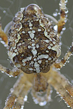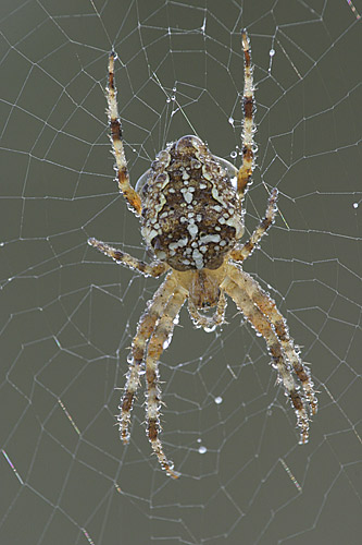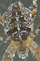 Ein Beispiel für diese Technik: Eine Kreuzspinne formatfüllend und mehrheitlich scharf abzubilden, ohne dass der Hintergrund zu unruhig wird, ist nicht einfach. Der Körper der Spinne ragt weit aus der Schärfeebene heraus, wenn die Spinne im Netz sitzt und auf ihre Mahlzeit wartet. Durch Einstellen der Schärfe auf den Kopf und die Rückenzeichnung sowie den Bereich dazwischen konnte ich aus den folgenden drei Aufnahmen, jeweils mit Blende 8 bis 13 (Ausschnittvergrößerungen)